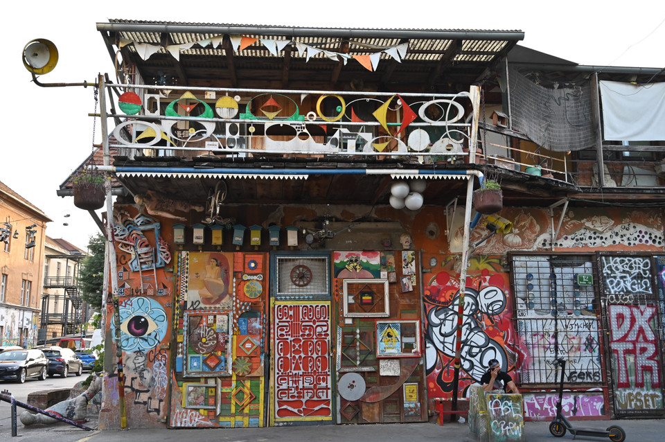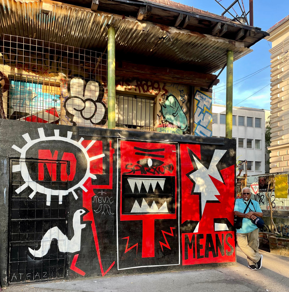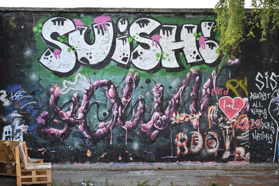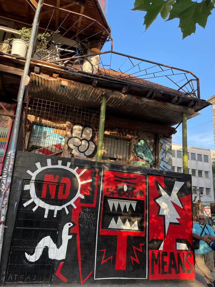 An urban squat community and autonomous social center in a former military base. wall art dominates all the structures.